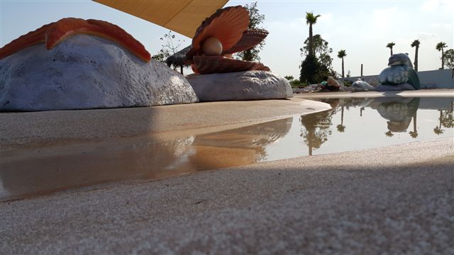 Banana Island Doha required some 375 square metres of wet-area surround. Ten workers had to bring materials via a 20-minute boat ride to the island, level the concrete site and pour the PolySoft to a thickness of eight to ten millimetres — a project that took six days to complete. Says Mortada, “The client is totally satisfied,” with the effect and the utility of the surface, which is seamless, hygienic and easy to maintain.